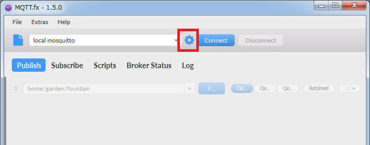 MQTT.fx を起動したら、以下の赤枠で囲った設定アイコンをクリックします。