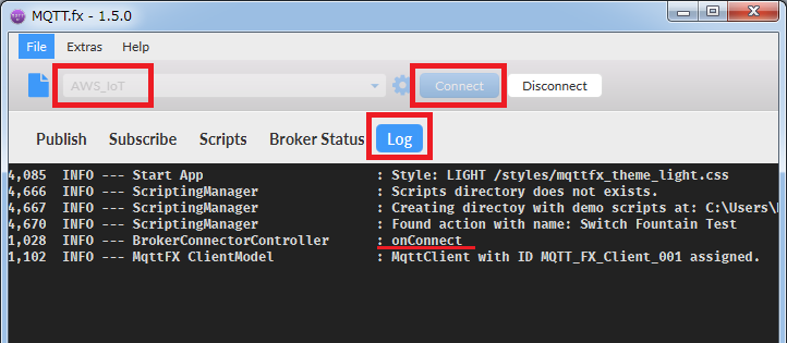MQTT.fx のメイン画面の [Log] のタブをクリックし、 接続先が 先程作成した Profile Name になっていることを確認して [Connect] をクリックします。