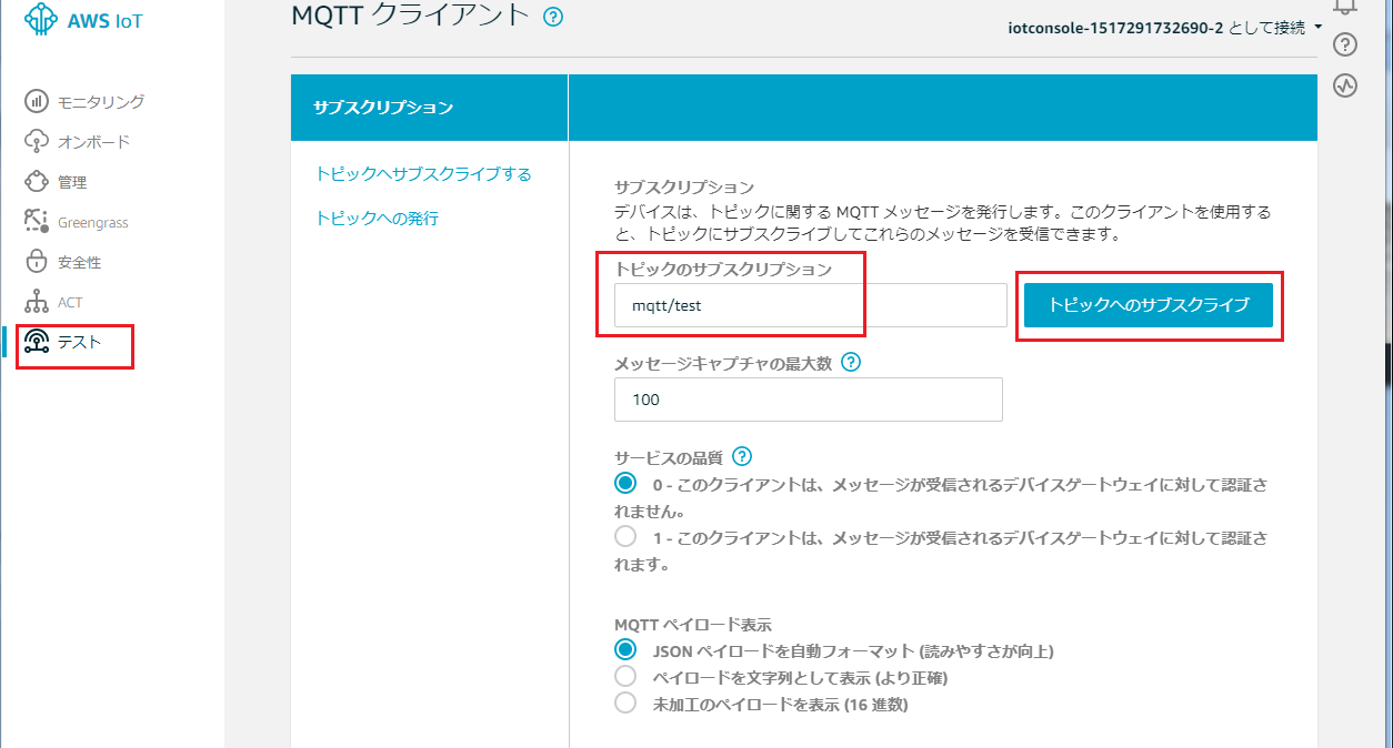 AWS IoT でもサブスクライブ手続きを行っておきます。
