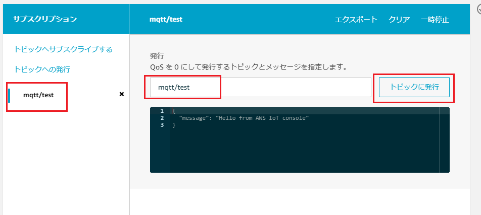 AWS IoT のこの画面のまま、パブリッシュしてみます。