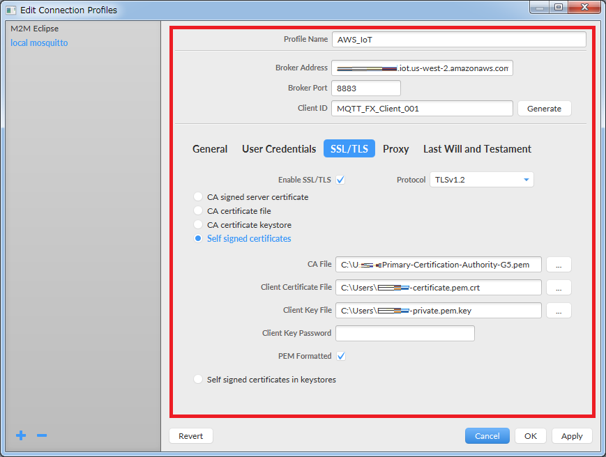 - Client Certificate File : DLした モノの証明書 *-certificate.pem.crt