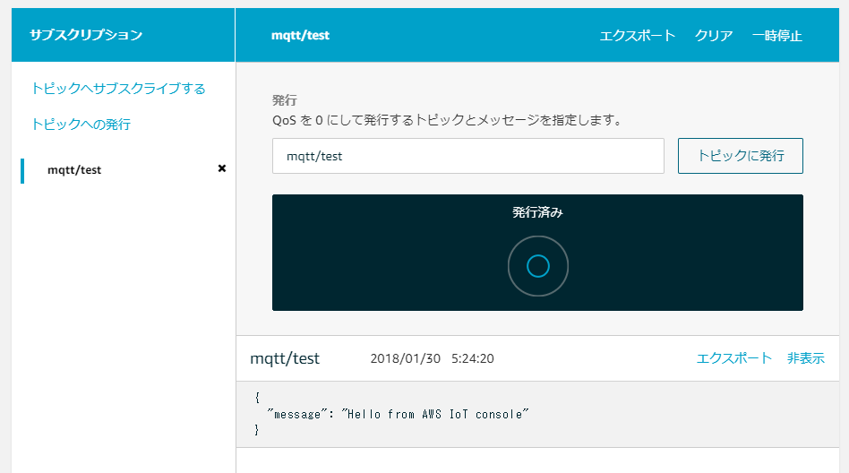 AWS IoT のテストページでは、 このままこのトピックにパブリッシュすることができます。