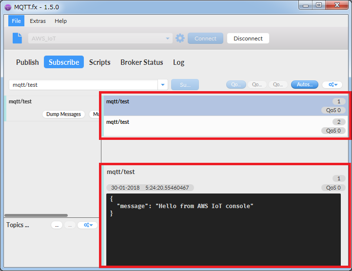 上の赤枠の部分が受信したトピックのメッセージ一覧で、 それを選択すると、下の赤枠に受信したメッセージの詳細が表示されます。
