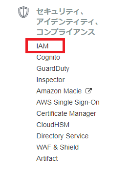 AWS コンソールへアクセスし、セキュリティ項目から [IAM] のページを開きます。