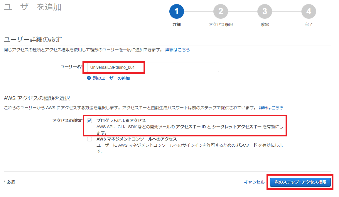 ユーザー名をユニークに指定し、AWSアクセスの種類として、[プログラムによるアクセス] を選択し、[次のステップ:アクセス権源] をクリックして進めます。