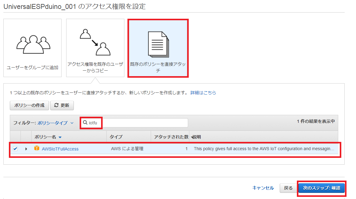 [既存のポリシーを直接アタッチ] を選択し、 ポリシータイプに [ AWSIoTFullAccess ] を選択して、[次のステップ:確認] をクリックして次に進みます。