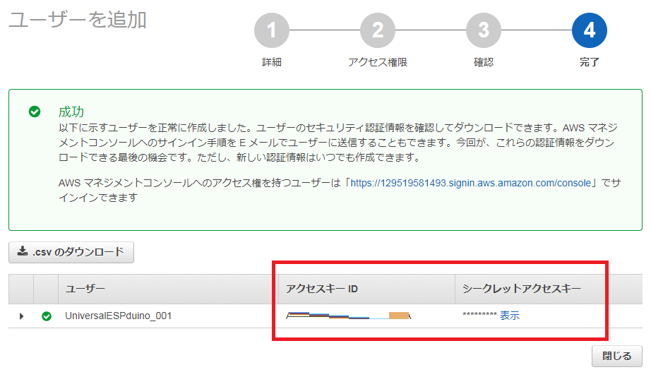 これで IAMユーザーが作成されました。 アクセスキーID と シークレットアクセスキー を表示させて 大切に保存しておきます。