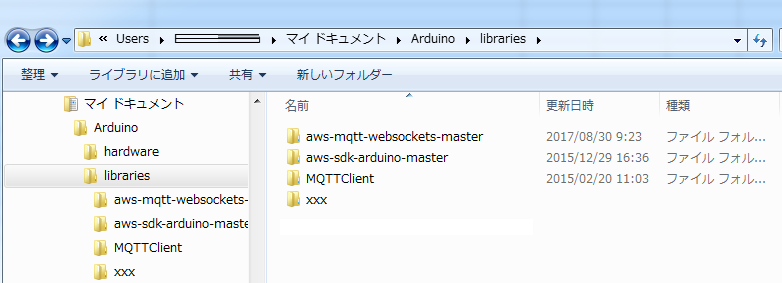 aws-mqtt-websocket と Paho MQTT for Arduino (Arduino Crlient Library)は ダウンロードして libraries ディレクトリ (Windows の場合は マイドキュメント\Arduino\libraries ディレクトリです) に展開します。