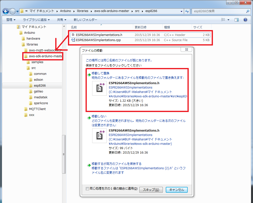aws-sdk-arduino は 同じくlibraries ディレクトリに保存しますが、 その後 src/common と src/esp8266 を aws-sdk-arduino のディレクトリに上書きコピーします。