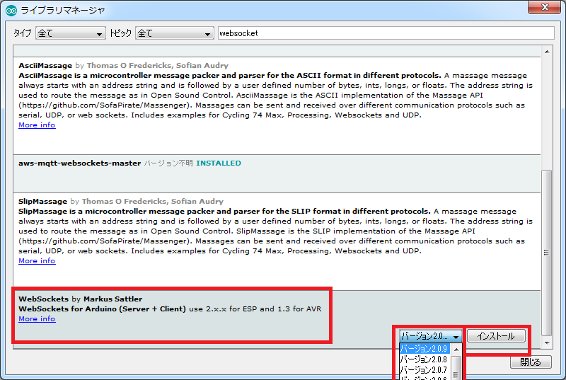 WebSocket for Arduino は Arduino IDE のメニューから [スケッチ] > [ライブラリのインクルード] > [ライブラリの管理] を開き、 WebSocket for Arduino (Server + Client) を探して最新バージョンをインストールします。