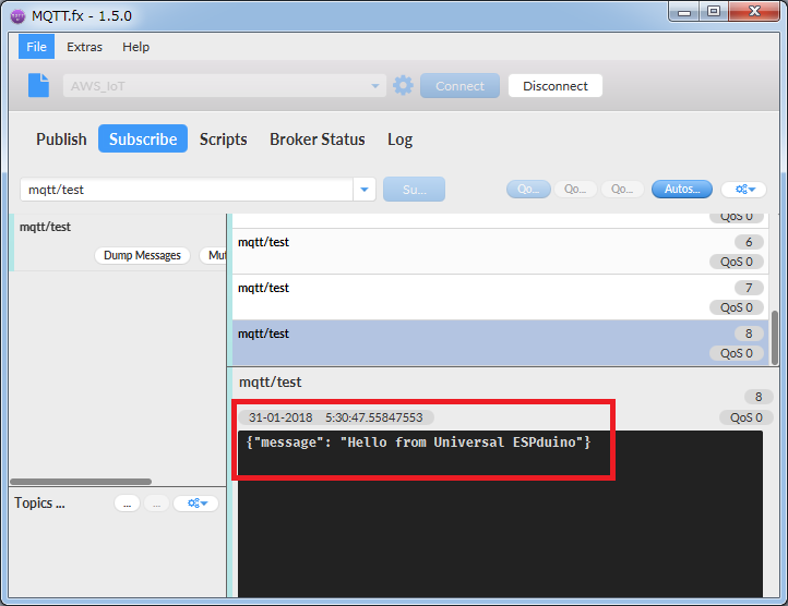 MQTT.fx で確認しても、以下のようにメッセージが無事にAWS IoT 経由で受信されている事が分かります。