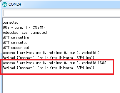 これで Universal ESPduino を使って ESP8266 (WROOM-02) から MQTT で AWS IoT に接続し、 パブリッシュ、サブスクライブができました!