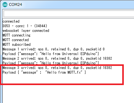 また、MQTT.fx からパブリッシュしても、シリアルコンソールにメッセージが受信されます。