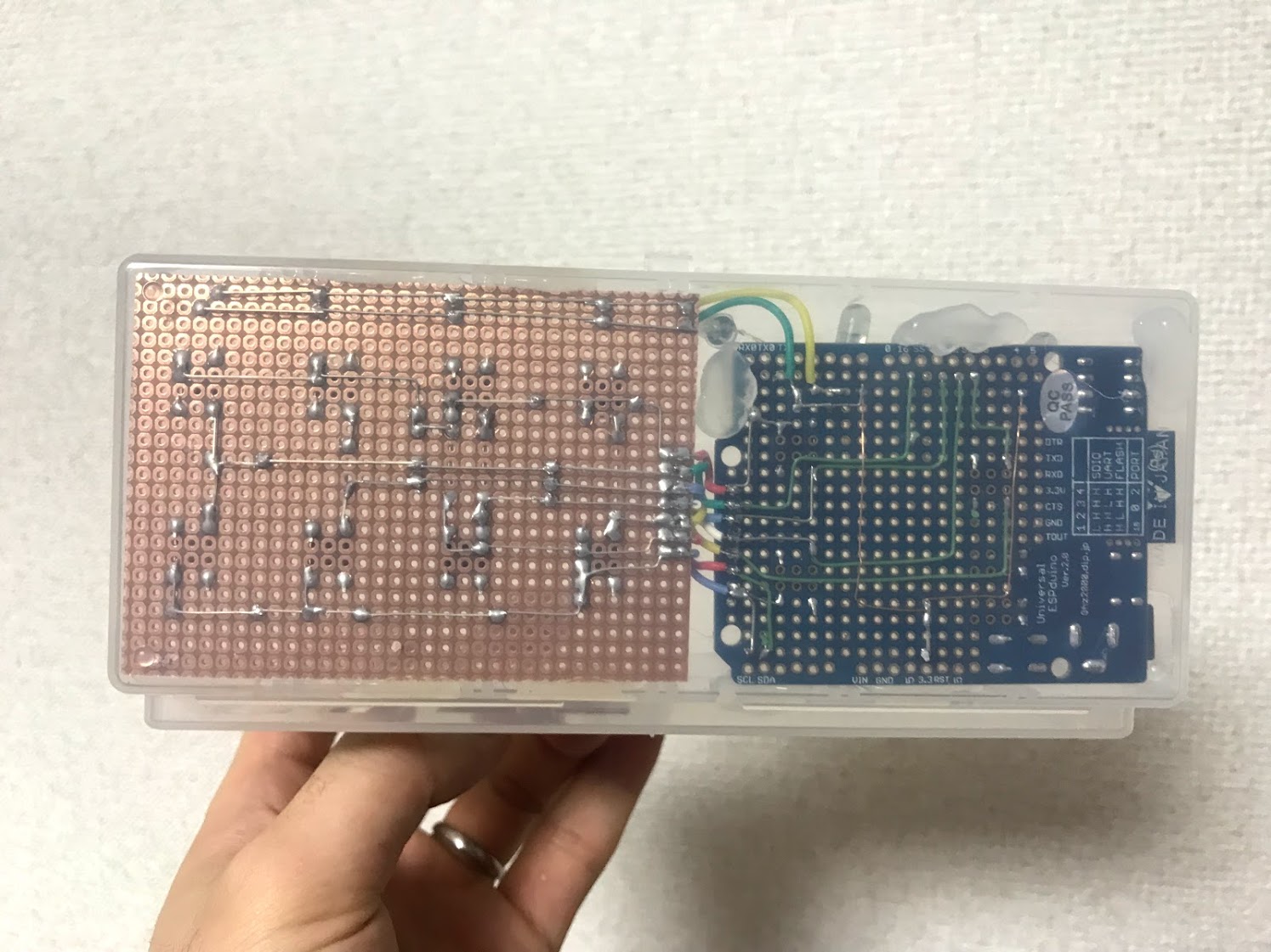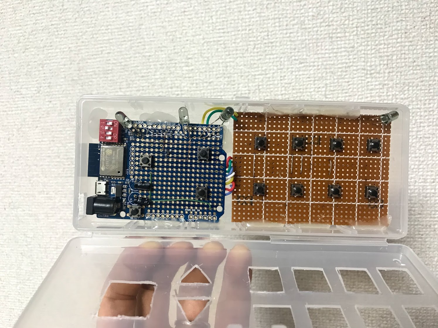 ケースは 100円ショップ の薄型ハードケースにカッターで穴を開けて、 3Dプリンタで出力した巨大ボタンをはめ込みました。