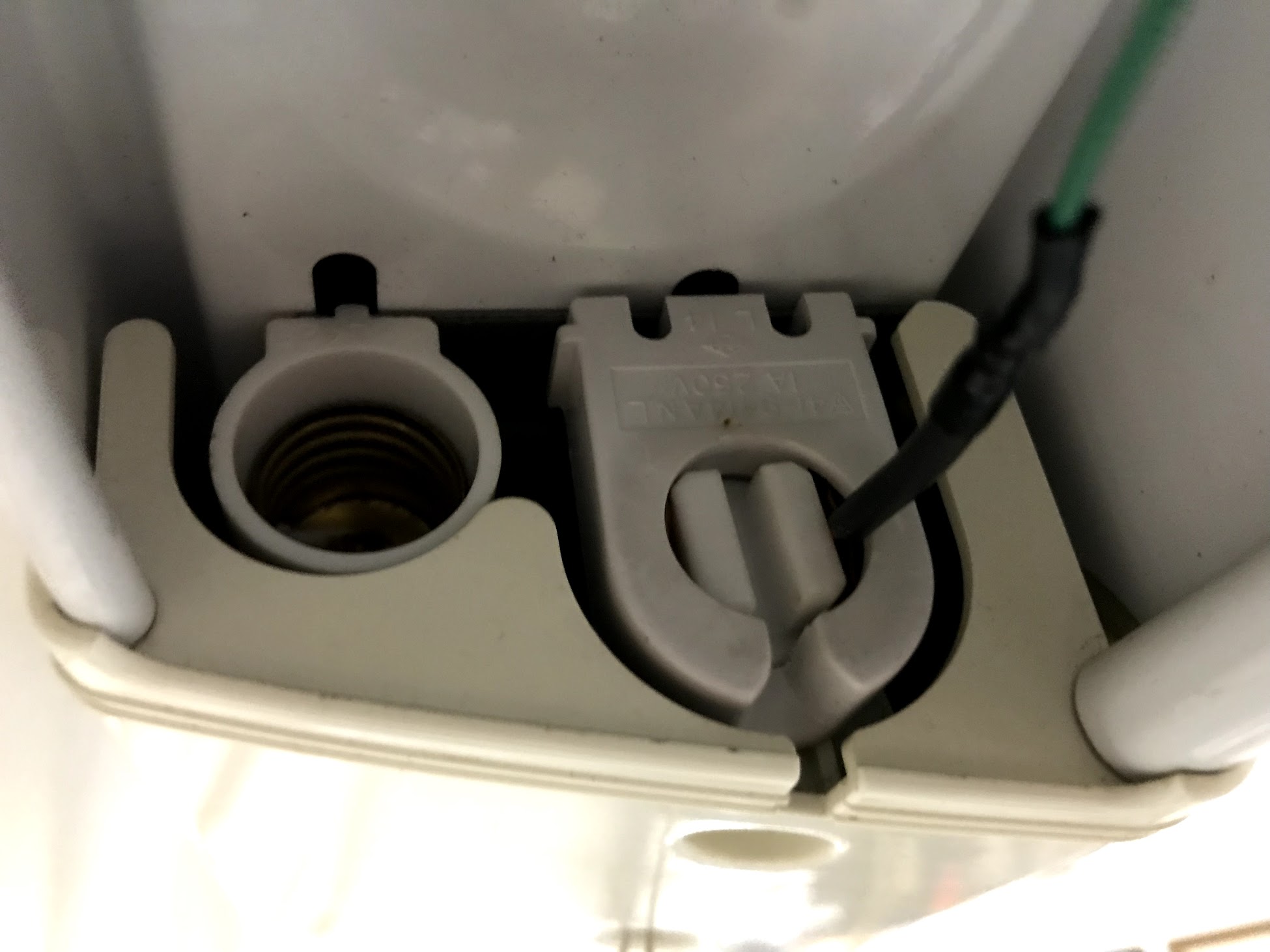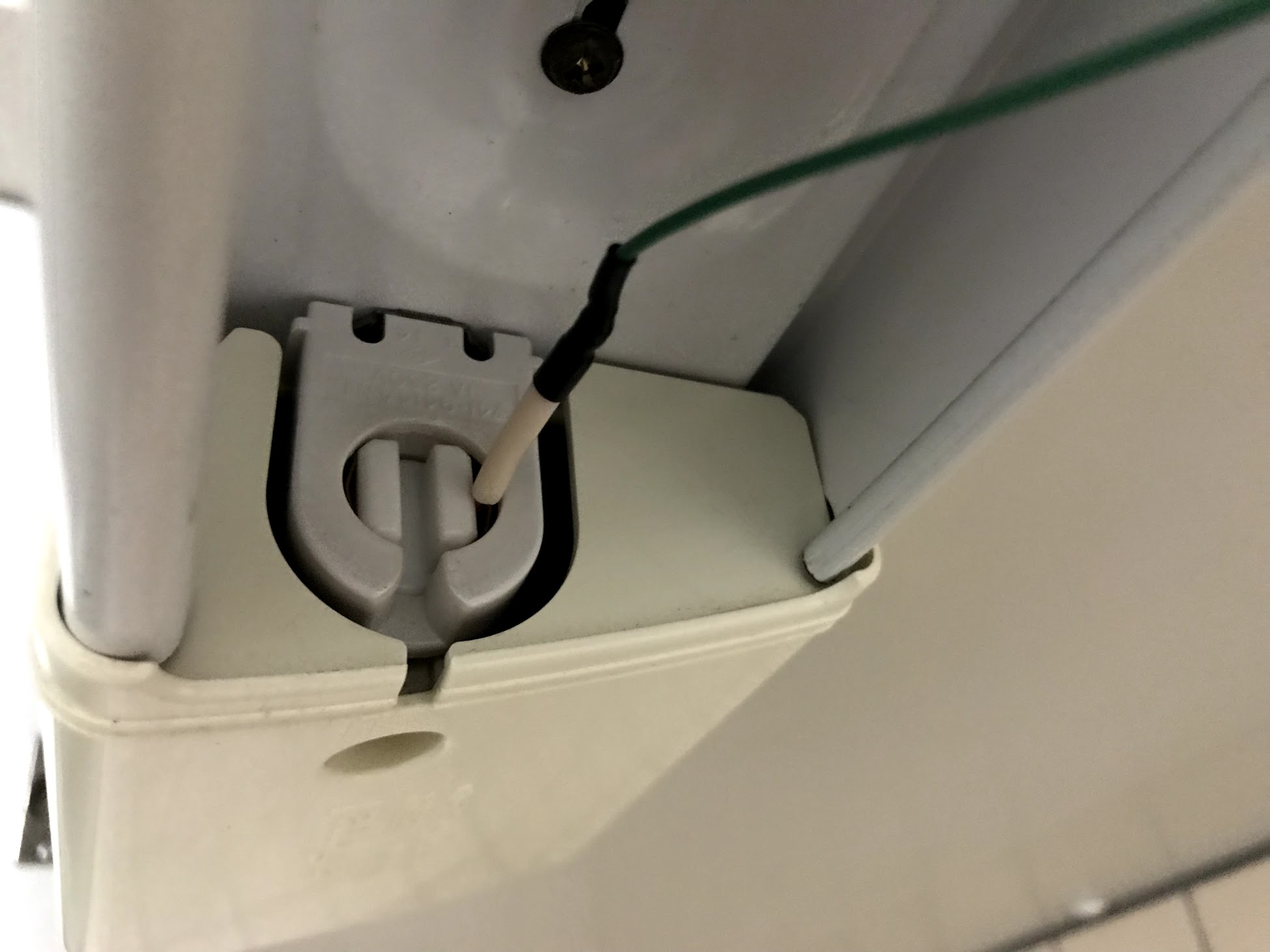 蛍光灯はグロー球を外すと両端の片側にAC 100Vがそのまま出力されるので、ここに単線を差し込んで電気を取りました。