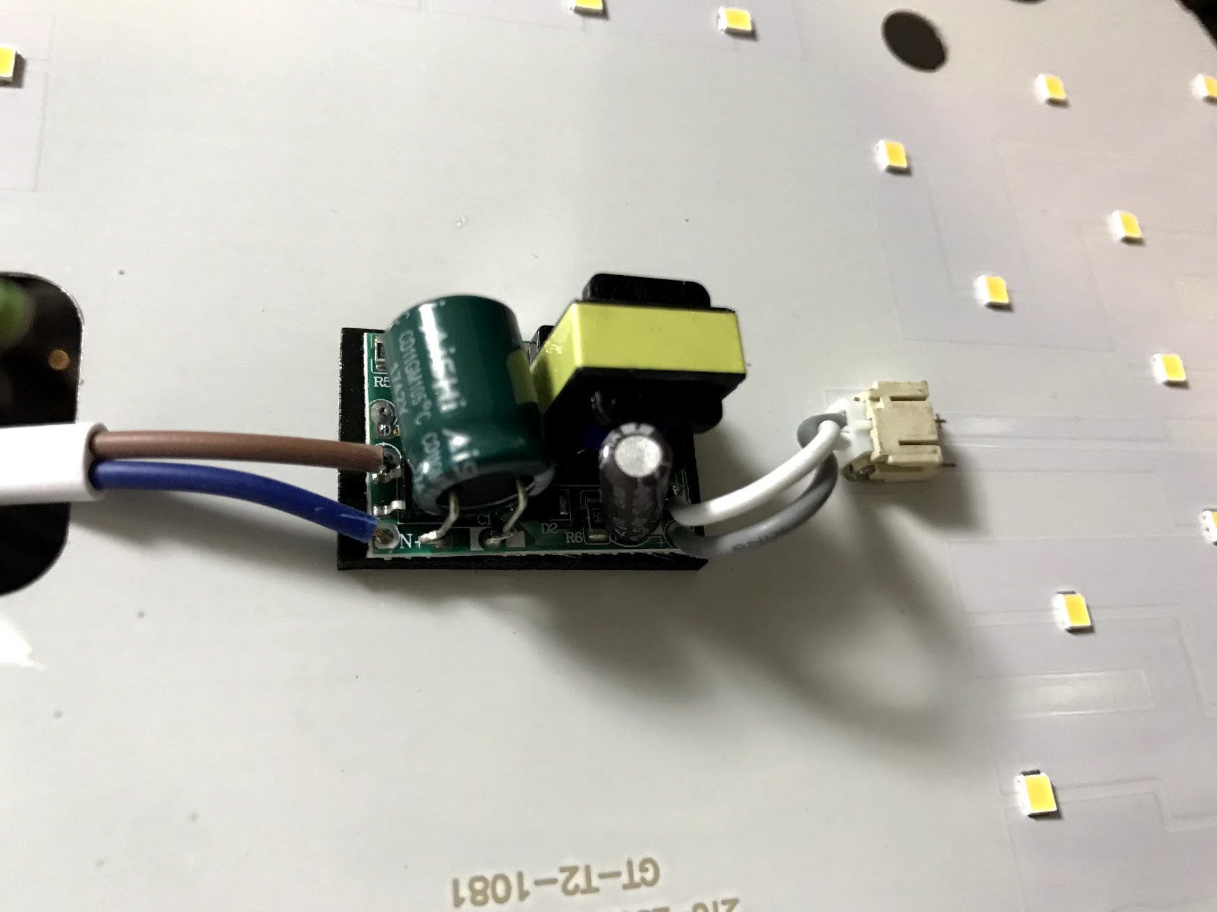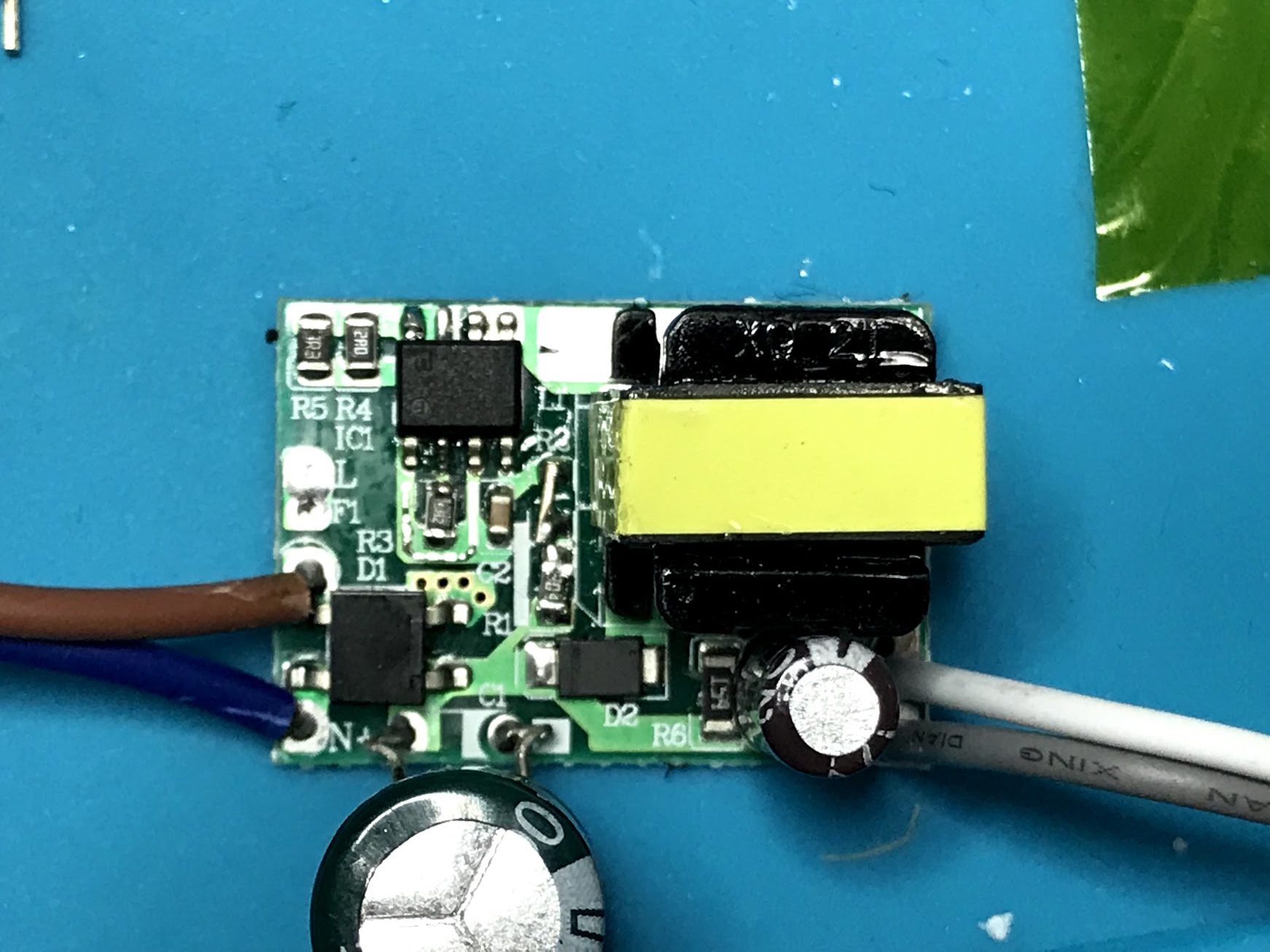 AC 220V 入力の LEDドライバ回路。 コンデンサとトランス(のように見えるがコイル) が目立つ