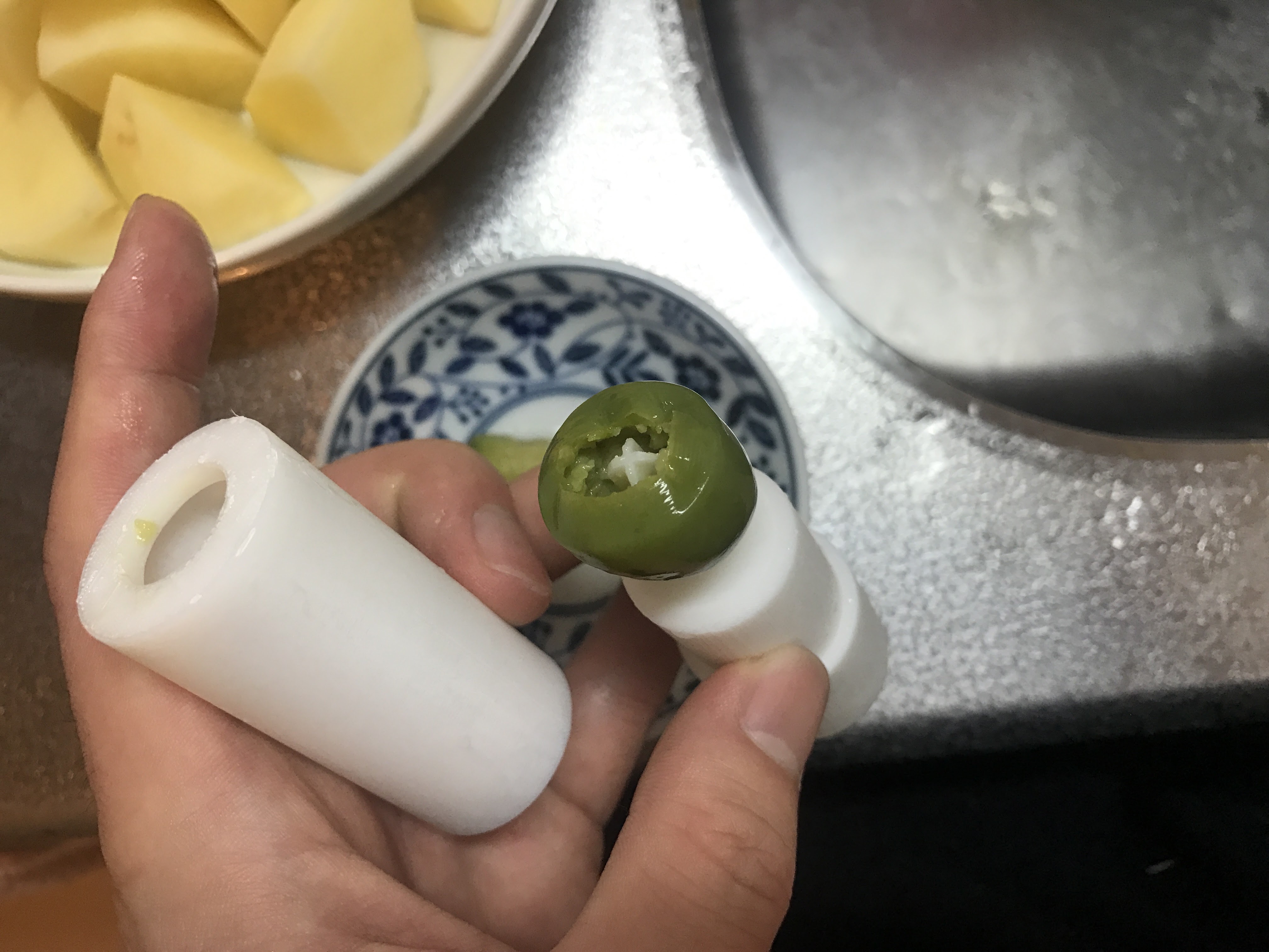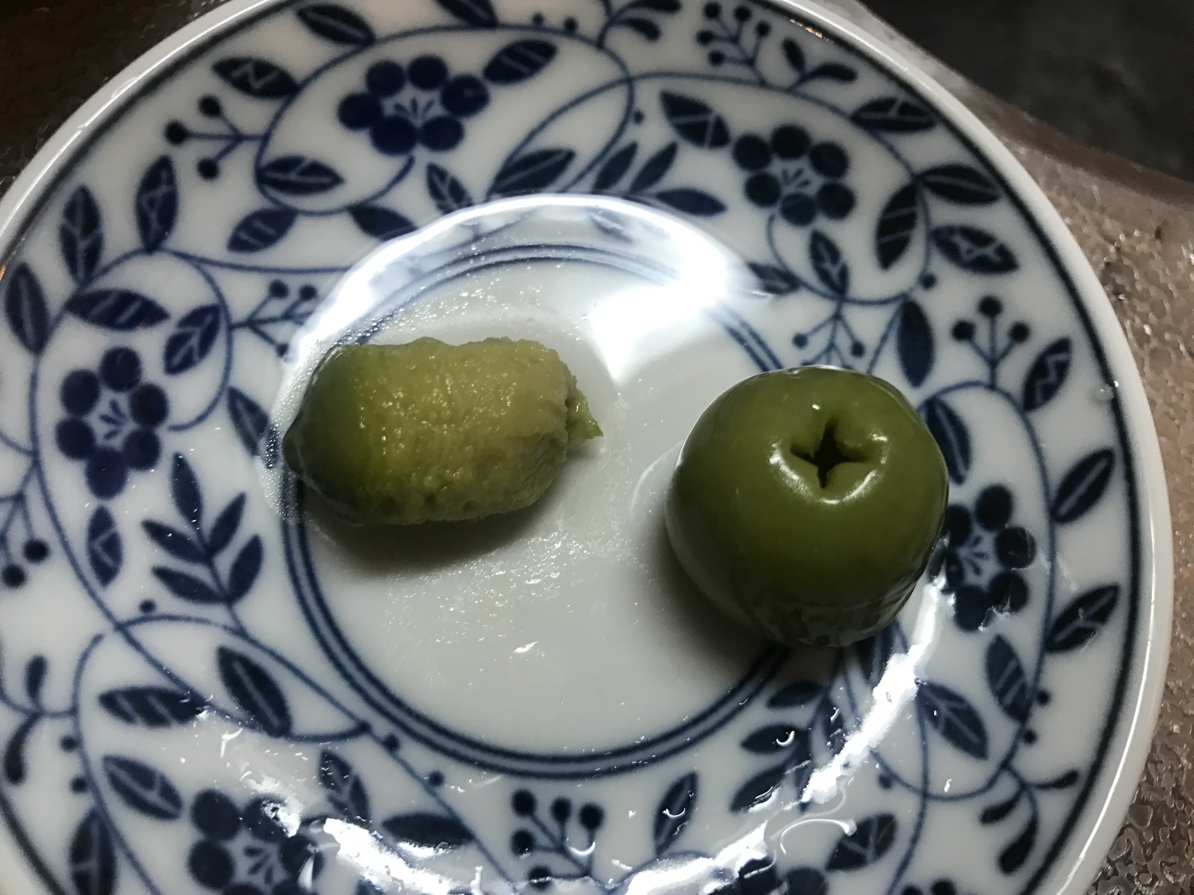 また、オリーブの種も銀杏みたいな形なので、円筒で抜くと可食部もだいぶ取り除かれてしまいます。